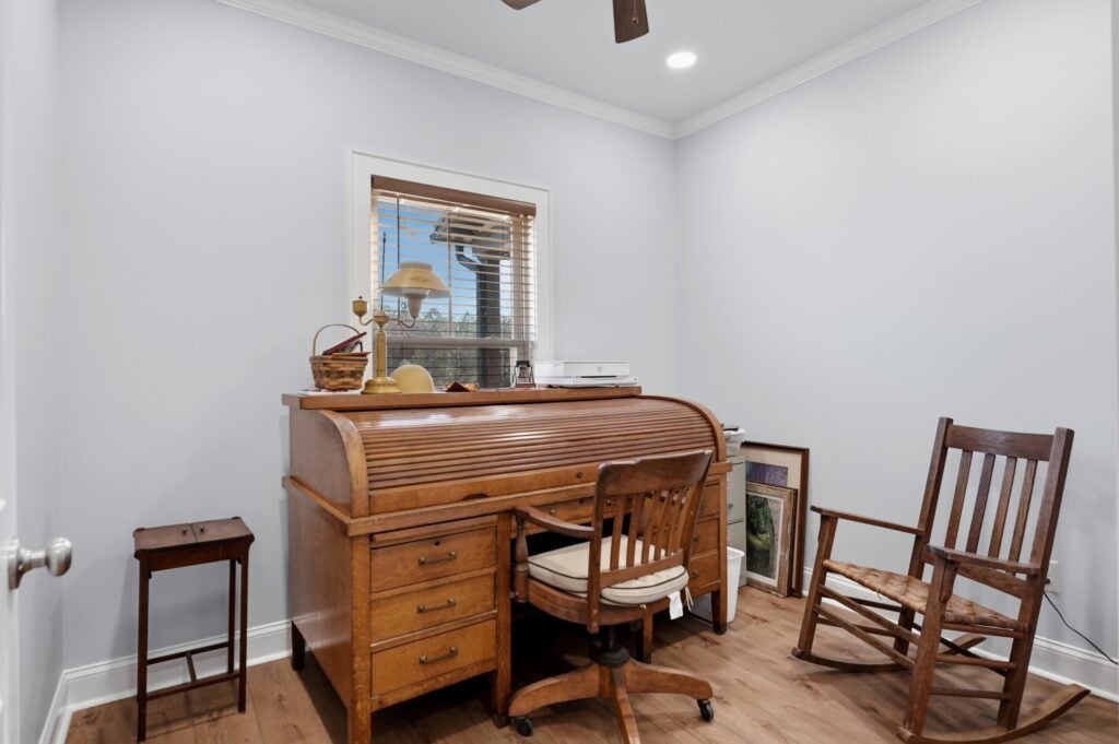 - Classic Decor: The office maintains the home’s “Refined Rustic” feel with a traditional wooden rocking chair and a classic brass-style desk lamp.