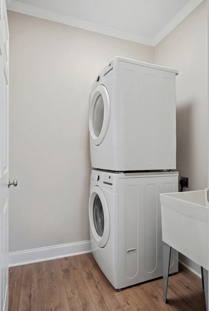 Stepping through the front door, the industrial exterior gives way to a “Refined Rustic” aesthetic. The home utilizes warm camel-toned walls and light wood-look flooring to create a cohesive, inviting flow throughout the open-concept living spaces.