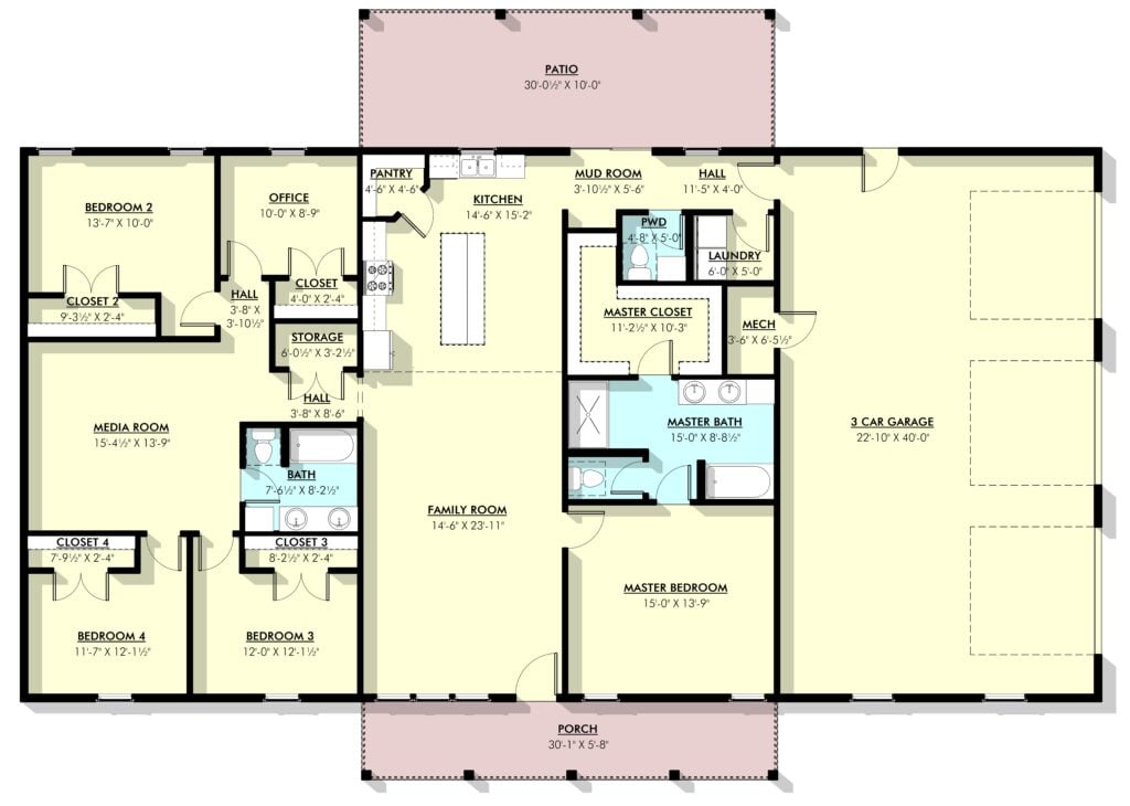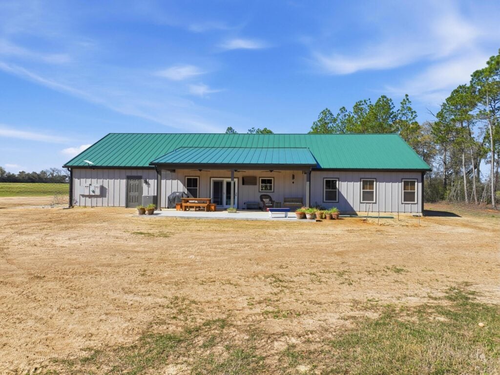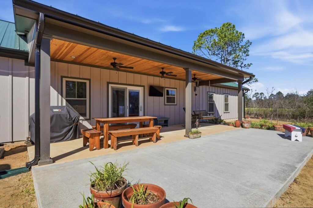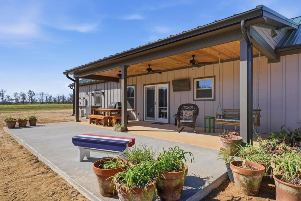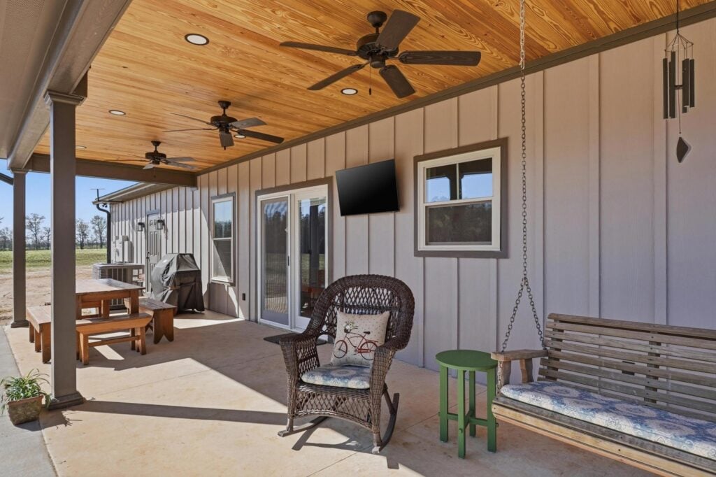 In a state where the horizon demands “breathing room,” the outdoor spaces are just as vital as the indoors. The rear of the home features an expansive patio with a wood-lined ceiling and outdoor fans. Whether it’s a morning coffee on the front porch or a summer barbecue on the back patio, this build is designed to celebrate the outdoors in every season.
