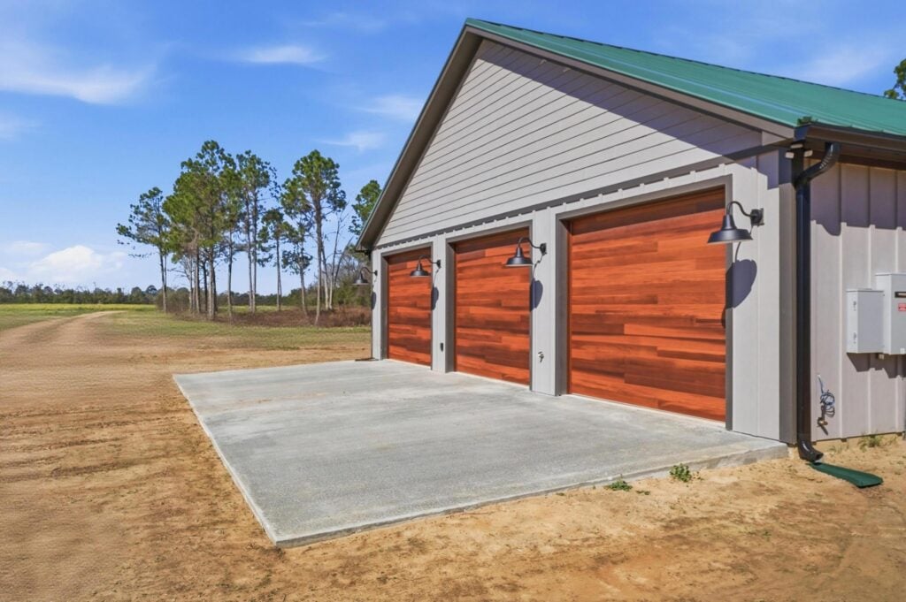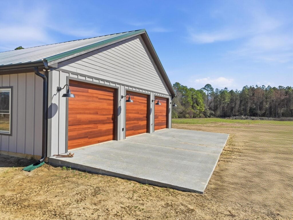 Triple-Threat Utility: A massive, attached three-car garage features warm wood-toned doors and black industrial gooseneck lighting, blending high-end style with everyday function.