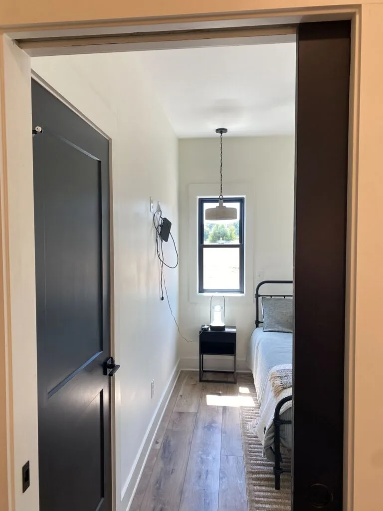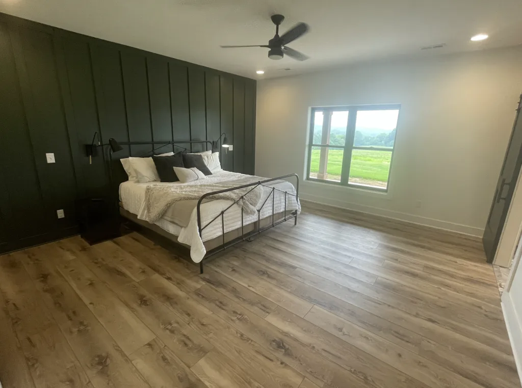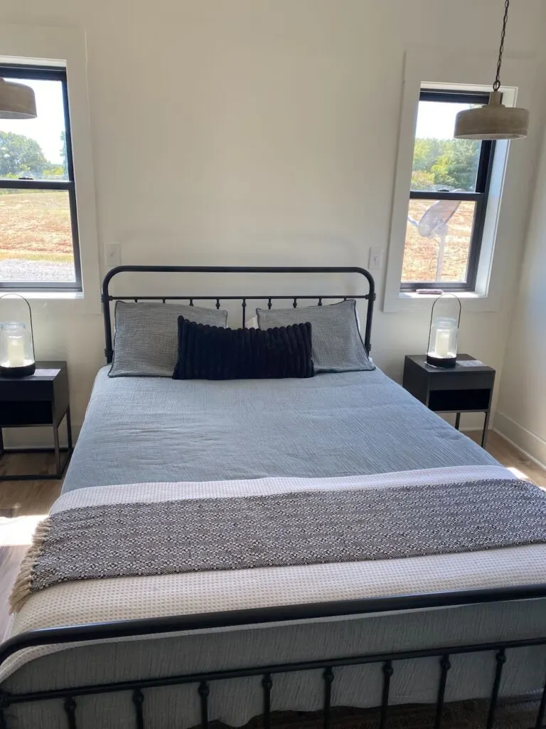 In the bedrooms of this Tennessee barndominium, muted neutral colors and a modern farmhouse aesthetic provide a cozy and calming retreat. Thoughtfully designed, these spaces offer comfort and style in a minimalist way, making them ideal for rest and relaxation.