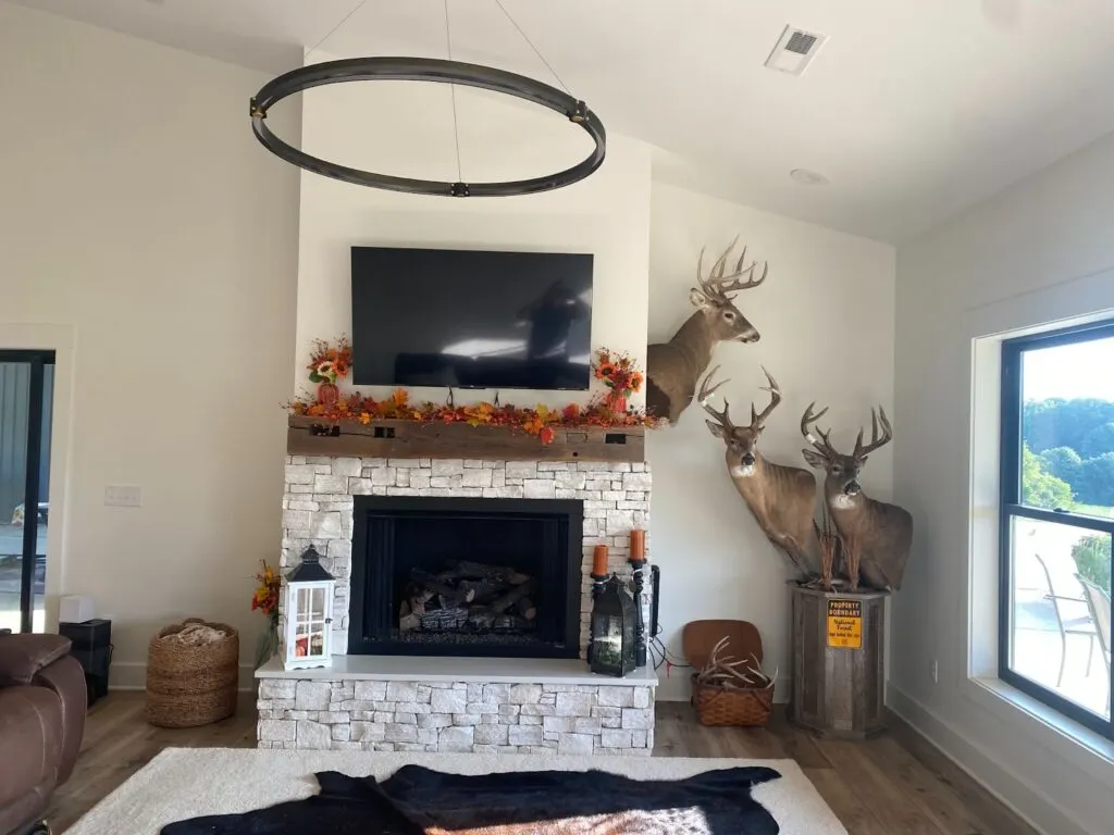 Cozy seating surrounds the fireplace in the living room, and rustic fall decor adds a seasonal touch. It all feels so homey and comforting.