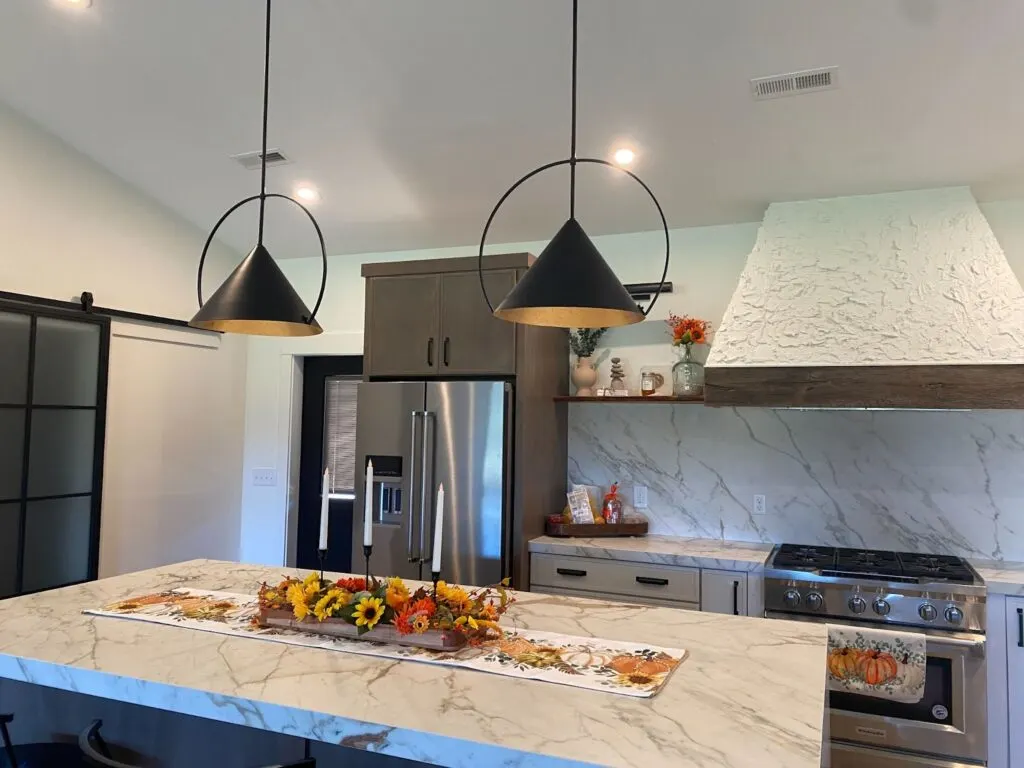 The barndominium kitchen is a true highlight. White marble countertops and an accent wall lend sophistication. This is complemented by modern light fixtures for an elegant touch.