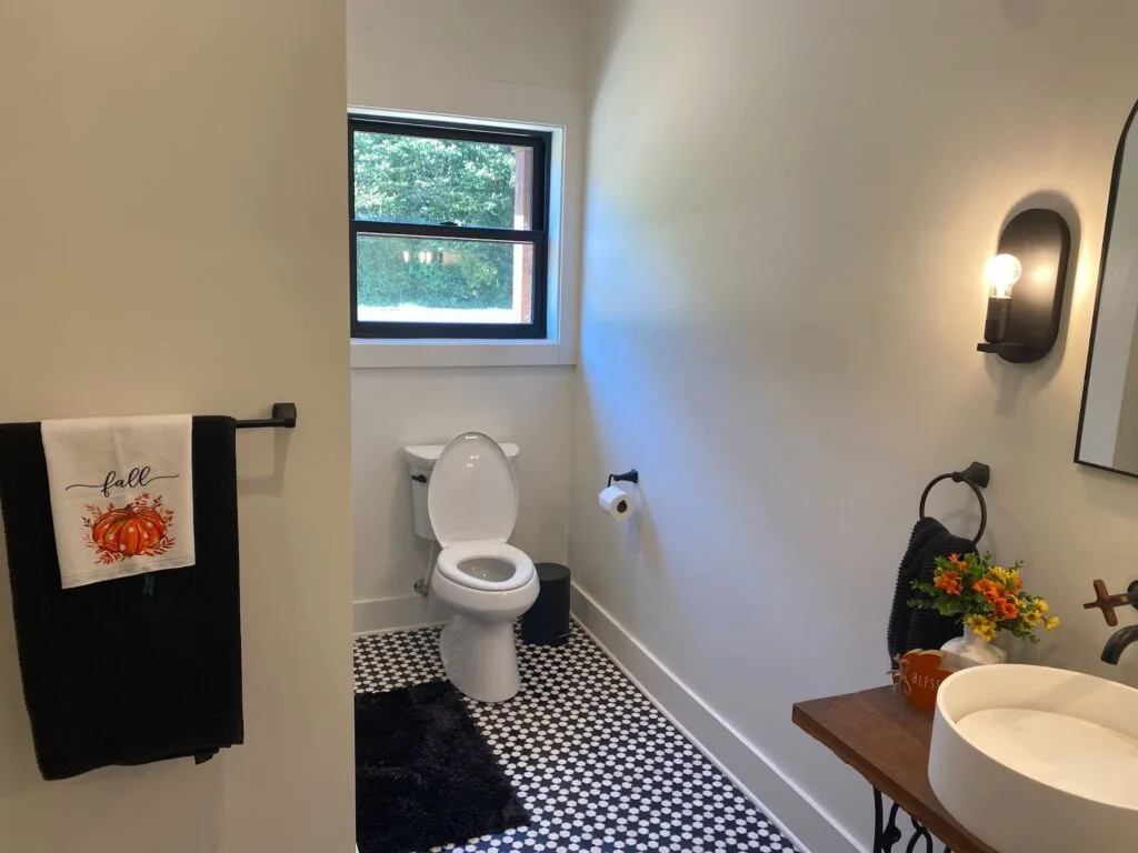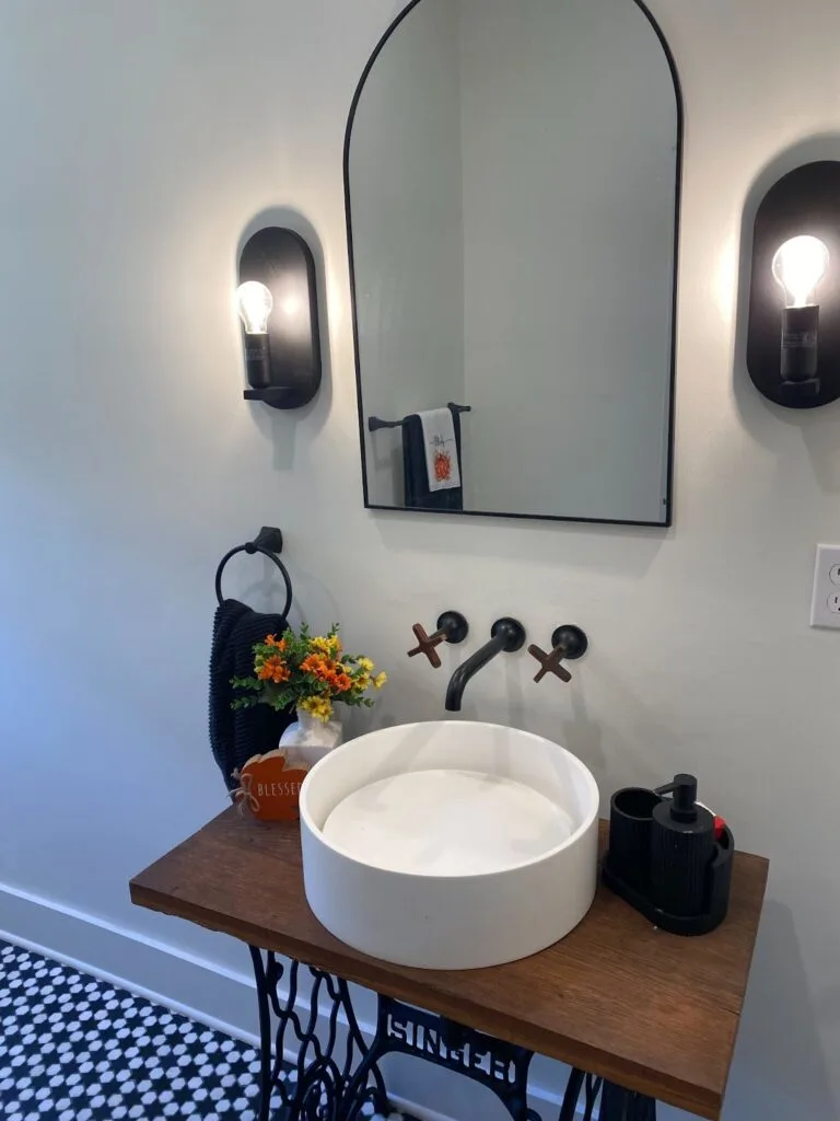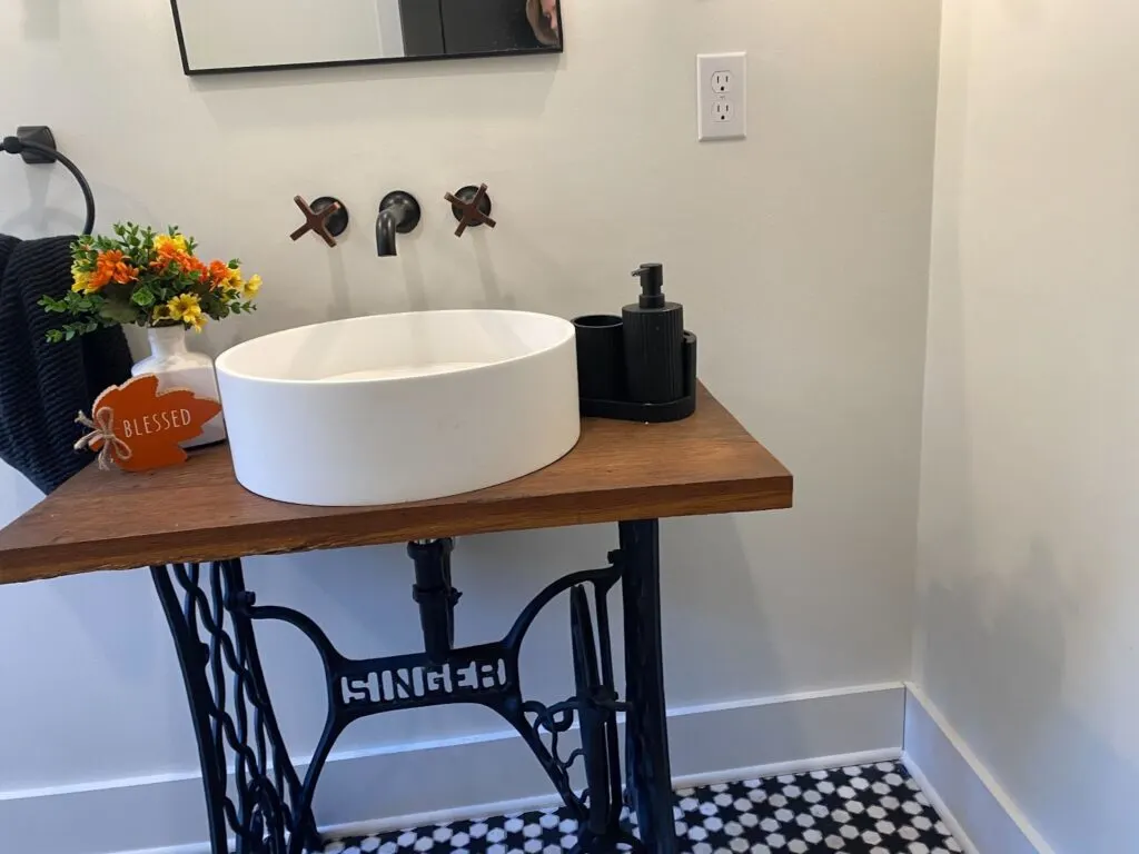 The bathrooms continue the modern, rustic theme with black-and-white patterned tiles, black fixtures, and a repurposed old sewing machine as a unique sink stand.