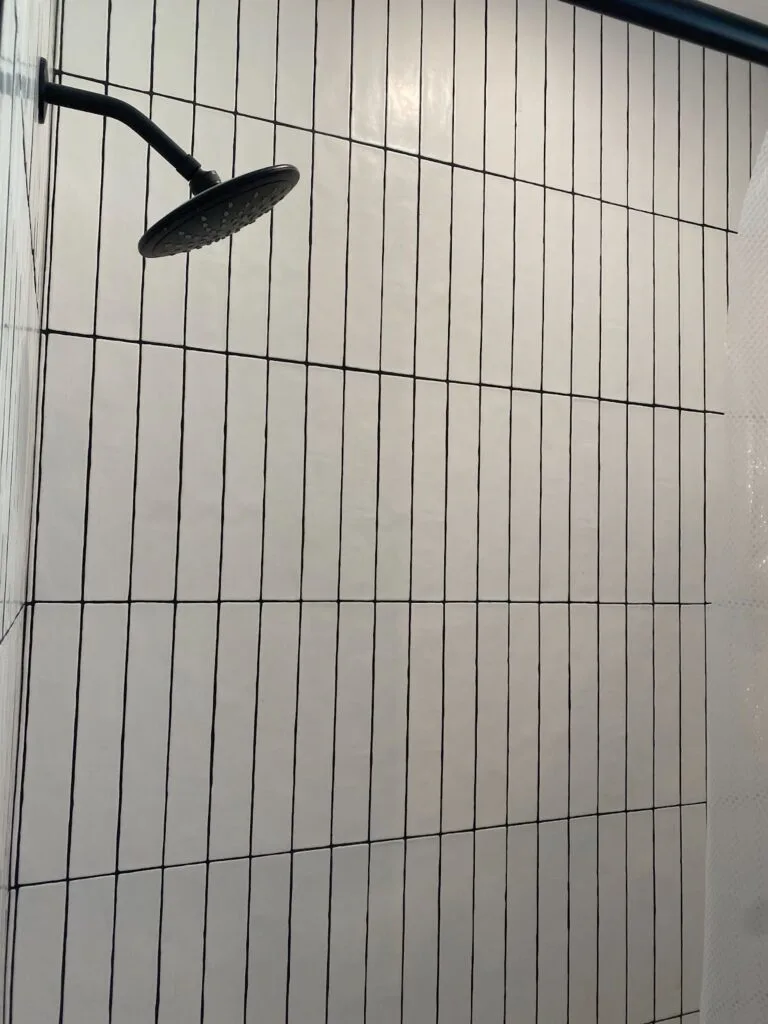 The minimalist shower and high-end double faucet sink give a touch of luxury. Small touches, like the gold finishes, elevate the space and make the bathrooms feel both stylish and functional.