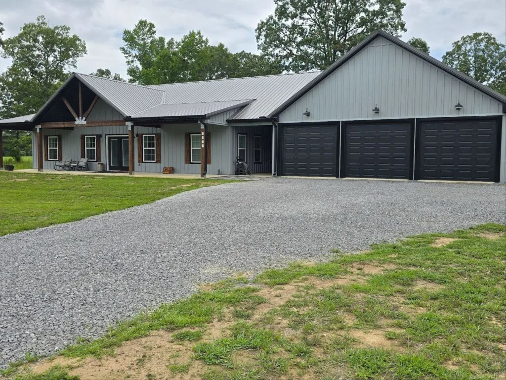 As you walk through the covered breezeway, your attention is drawn to the three-door barndominium garage. The black garage doors pop against the gray exterior.