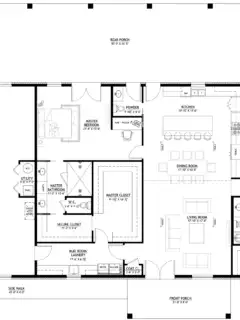 And here we are, at the very end of our journey. We conclude our tour by looking at the detailed floor plan of the Brooke Barndominium, which reveals the thoughtful and functional layout we’ve just experienced. This blueprint-like view highlights the seamless flow between the front porch, foyer, dining room, kitchen, and living room, all designed to create a large, open-concept space.