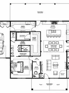 The plan also shows the clear separation between the communal areas and the private wings, with the master suite on one side of the house and the additional bedrooms and office on the other. Finally, you can see the convenient access to the laundry room and the spacious 2-car garage, which even includes a mud room and a dedicated safe room. This plan truly illustrates how every square foot of this home has been designed with livability and convenience in mind.