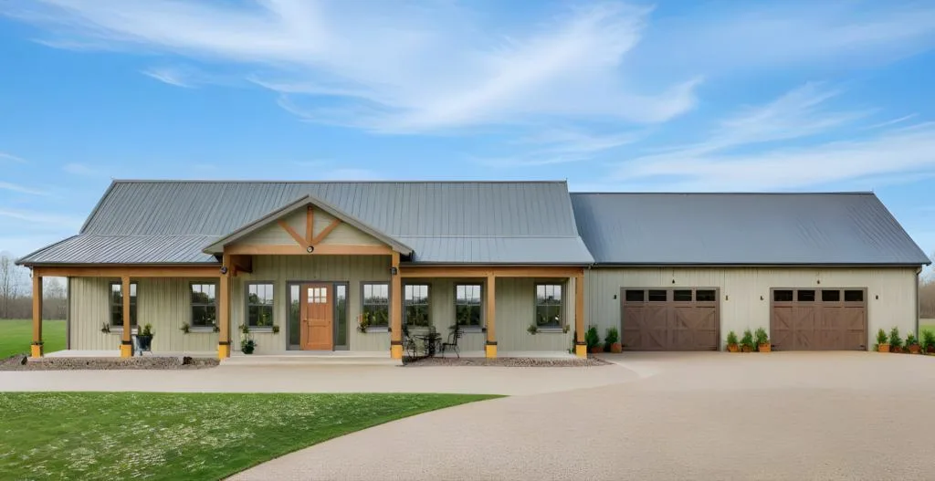 Here we see a fresh take on the Brooke Barndominium, with a bold and contemporary color palette that stands out against the stark, golden landscape. The striking light blue metal roof offers a modern contrast to the familiar white siding, providing a cool and crisp aesthetic that feels both durable and stylish. A wide gravel driveway leads to sleek black glass garage doors, adding a touch of industrial chic and completing this uniquely refined exterior.