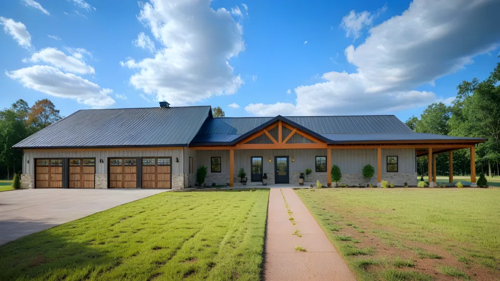 This inviting view captures this barndominium kit nestled harmoniously within its surroundings, showcasing the smooth transition from the manicured lawn to the home’s striking entryway. The blend of low-maintenance landscaping, featuring small trees and colorful shrubs, softens the stone and stucco elements, enhancing the home’s curb appeal. The large, mature tree on the right side provides a sense of established charm and offers a natural boundary for this beautiful country retreat.