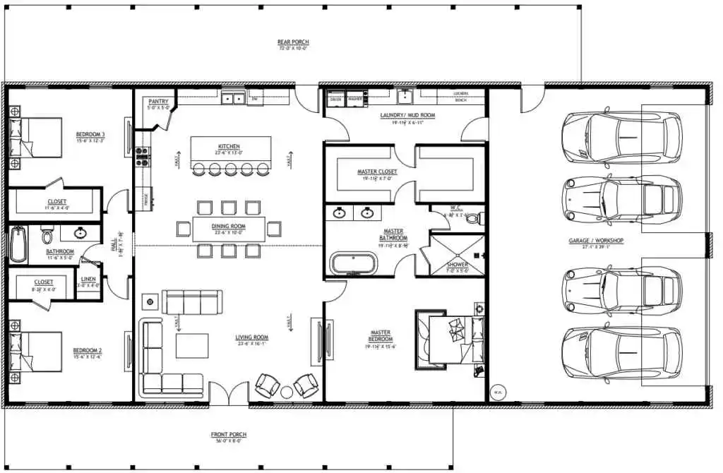 For more barndominium floor plans, check out our complete collection of 3-bedroom barndominium floor plans.