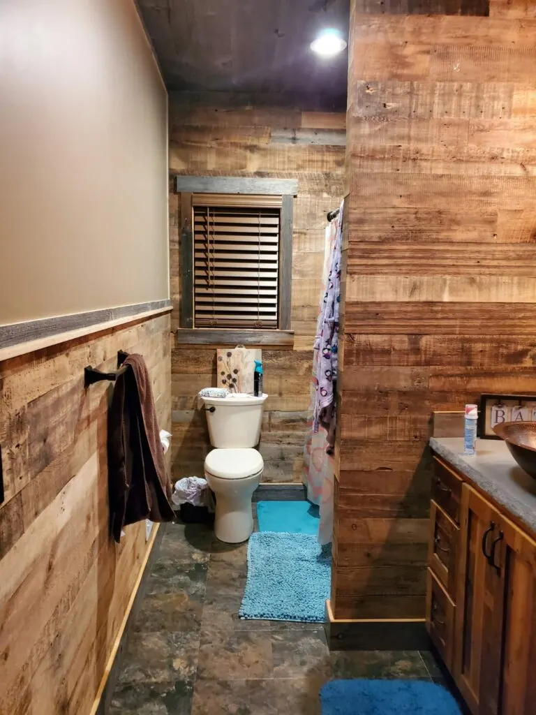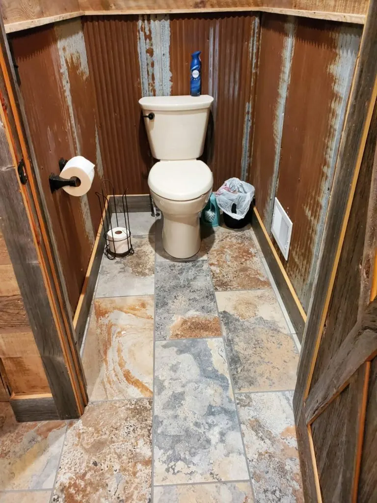 The toilet is closed off from the main bathroom space with a separate door. Rustic galvanized metal siding surrounds the space.
