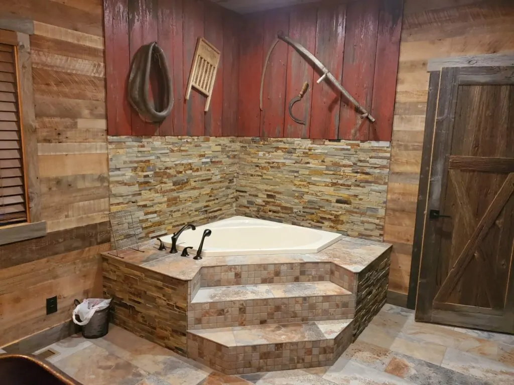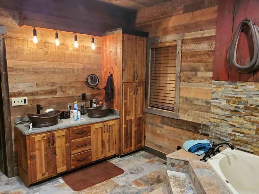 Exterior red barn wood over the tub is decorated with rustic Amish tools. Exposed bulbs hanging over the vanity go with the rural theme of the house. Sinks raised above the countertop also contribute to this effect. The sinks are beautiful, with a fish scale design and fish raised up into the structure of the sink.