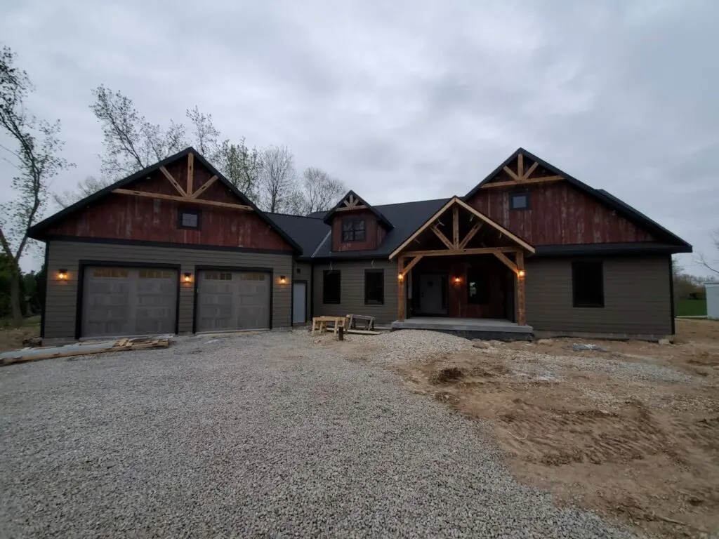 However, the peeks over the garage and over the front of the house are decidedly barn-like, with weathered red barn wood and beautiful exposed beams. Charming lanterns hang from various points, accenting the look of the design. The patio is the perfect place to hang out in a rocking chair and take in the beautiful Wisconsin scenery.