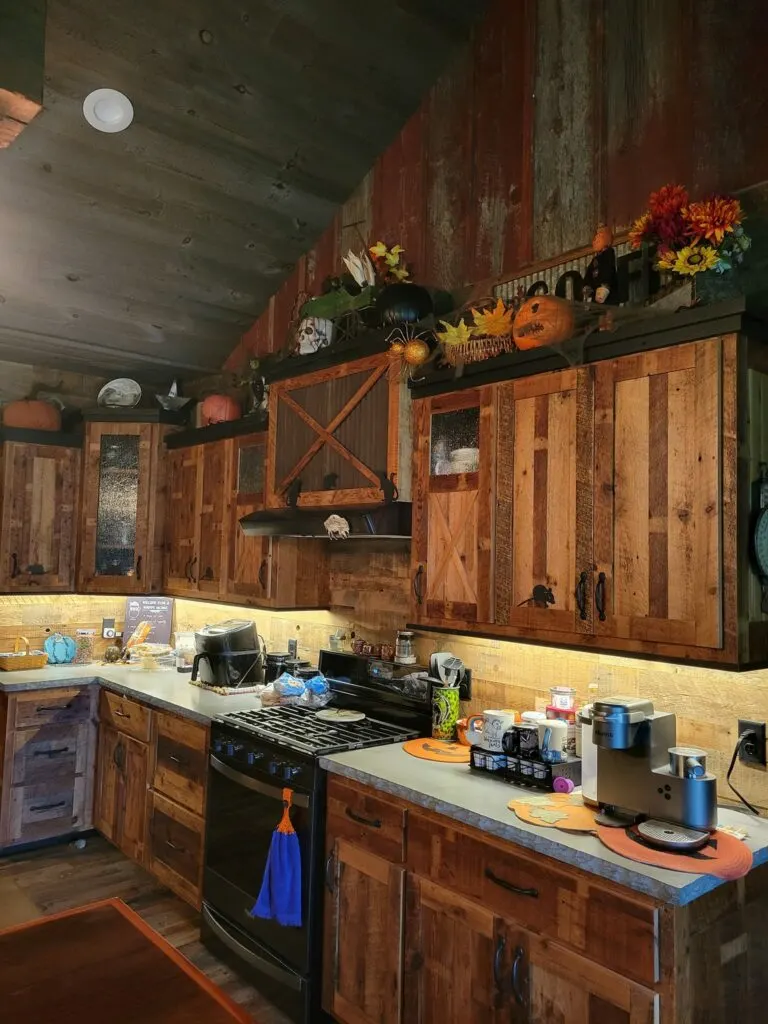 The walls are made from a variety of softwood and the flooring is several different types of hardwood. The entire ceiling is aged pine and the cabinets are mixed softwood.