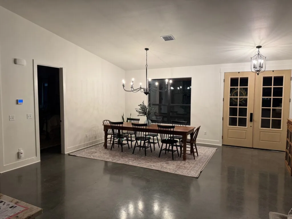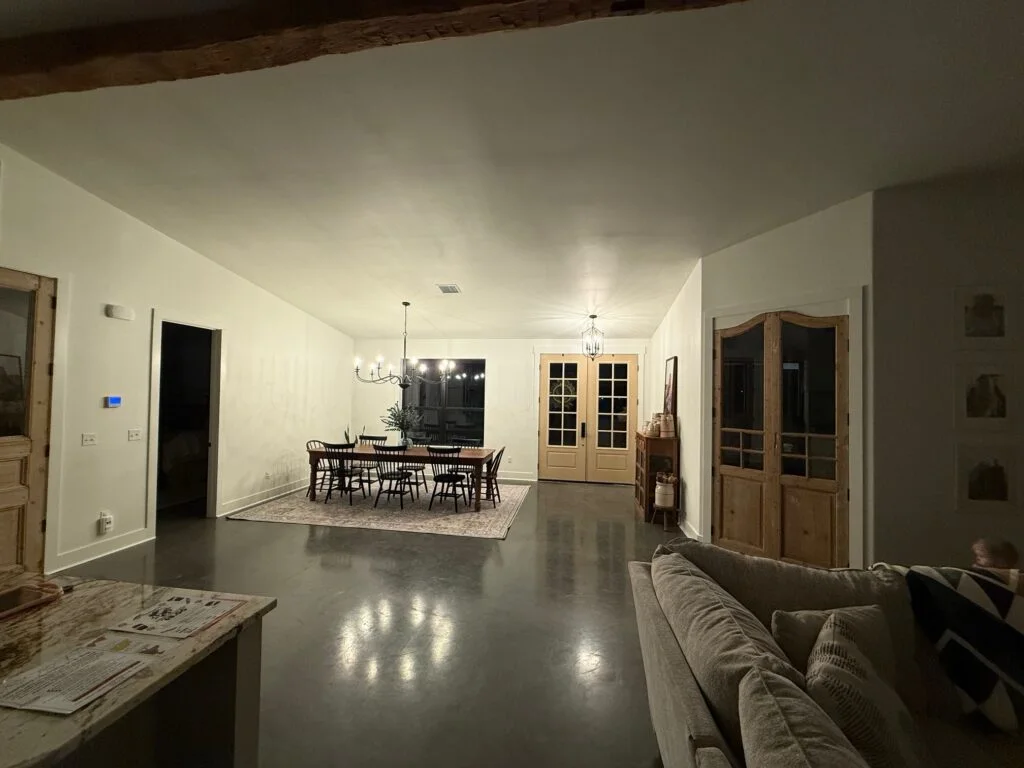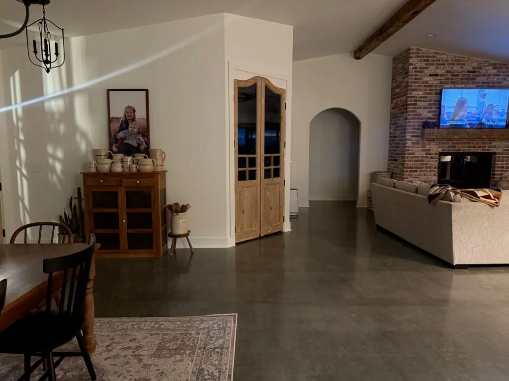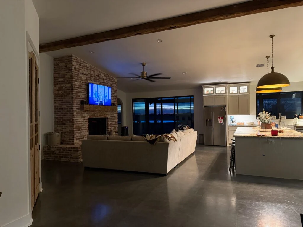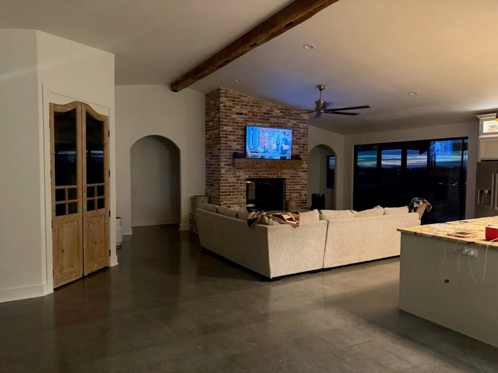 The central living area is anchored by a floor-to-ceiling white-brick fireplace, topped with a chunky wooden mantel and a large screen for family movie nights. Gleaming polished concrete floors run throughout the space, providing a durable, modern foundation that reflects the natural light pouring in from the massive glass doors. Overhead, a thick, reclaimed wood beam adds architectural character, perfectly balancing the clean white walls.
