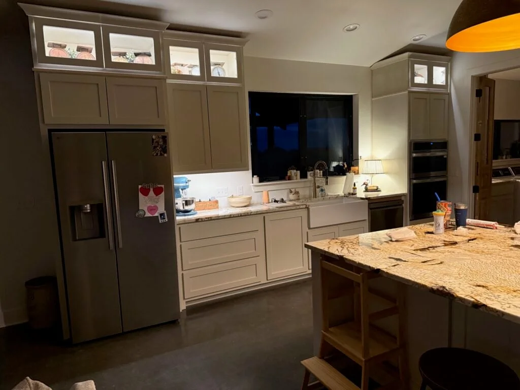 - Custom Cabinetry: The perimeter is characterized by off-white shaker-style cabinets, some featuring lighted glass-front uppers to display collectibles.