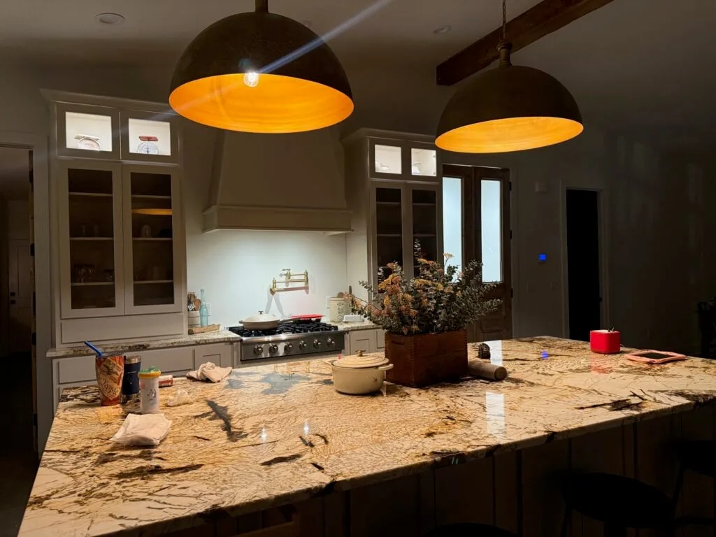 The kitchen is a true centerpiece, featuring a massive island with a stunning marble-patterned countertop and a pair of oversized, weathered-metal pendant lights that cast a warm, golden glow.