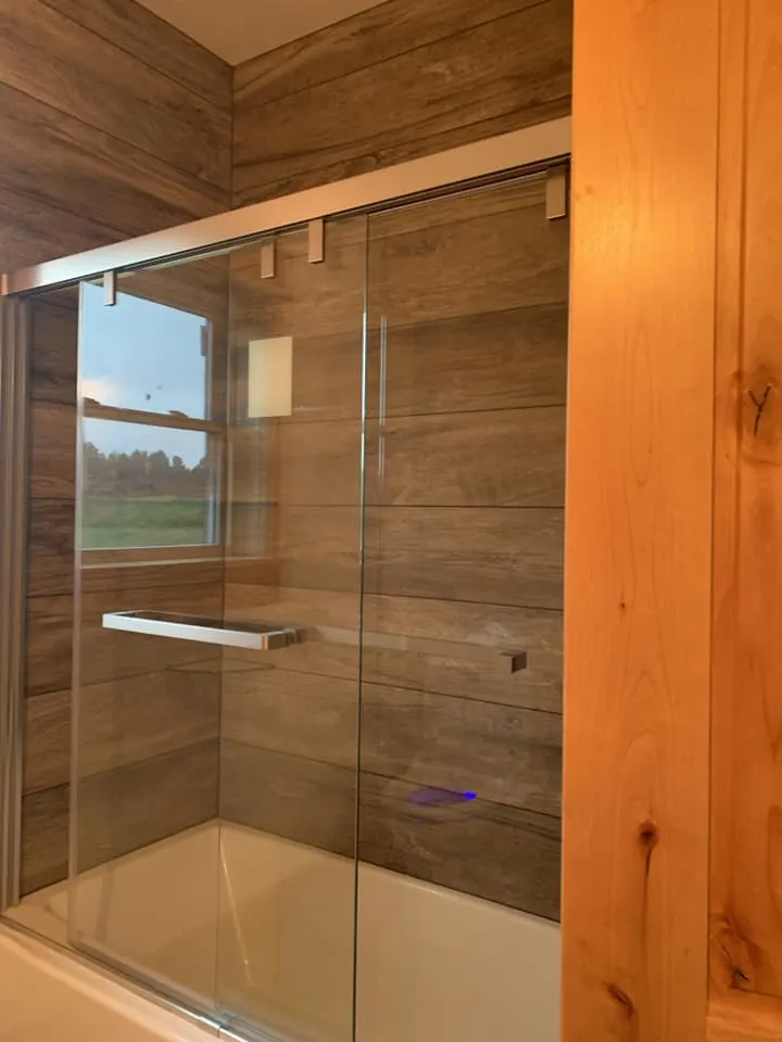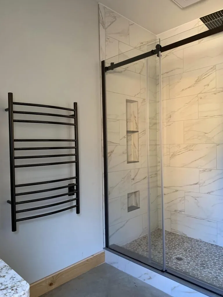 These barndominium bathrooms exude luxury. It features a luxurious copper freestanding tub, a split double vanity, and modern touches such as glass shower doors and wood panels, a perfect blend of comfort and sophistication. Additionally, the showers are fitted with glass doors and wood panels.