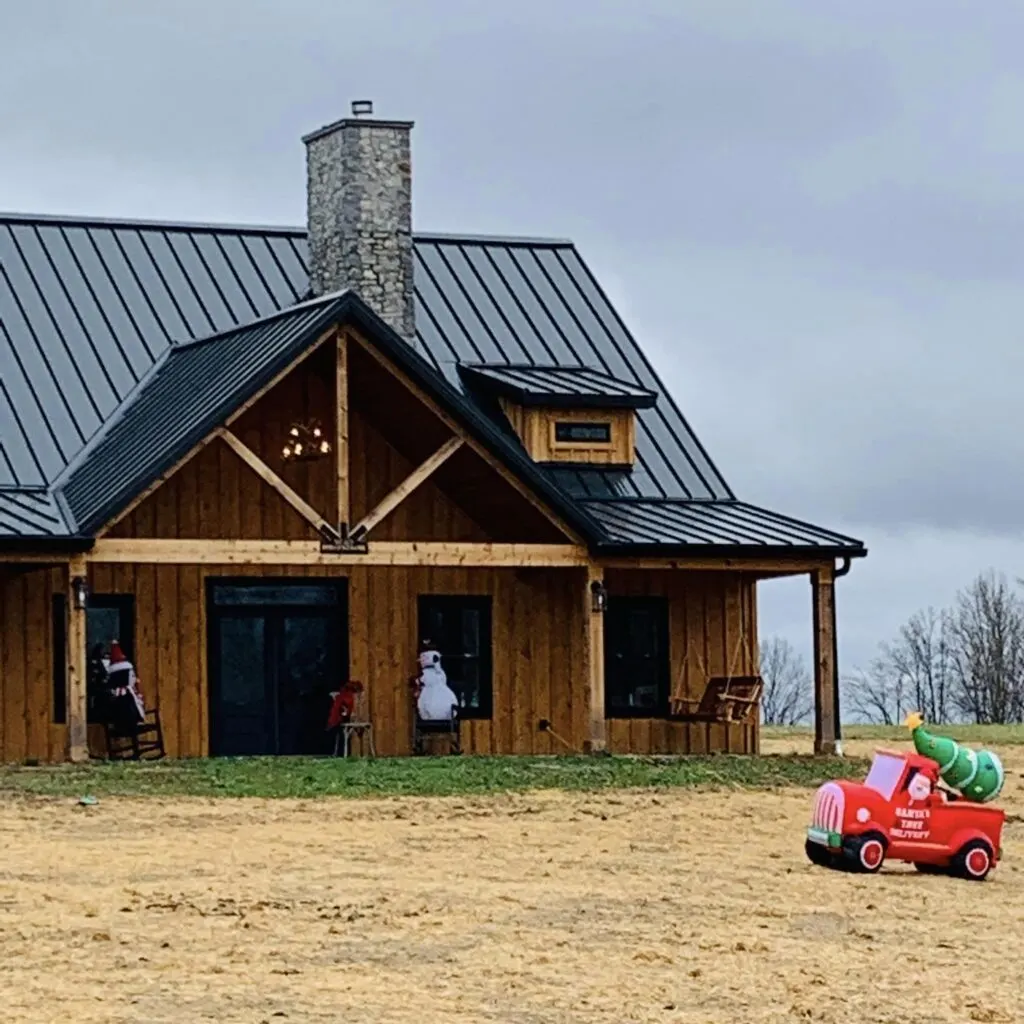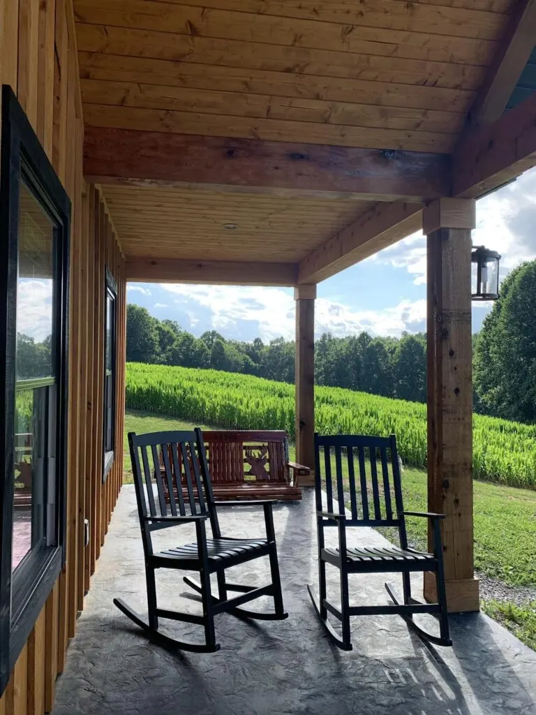The side-to-side covered front porch beckons with its timeless allure, adorned with plenty of benches and rocking chairs where you can sit back, relax, and take in the serene surroundings. Wood beams and pillars gracefully support the roof, adding to the home’s rustic appeal while providing a sturdy framework for years to come.