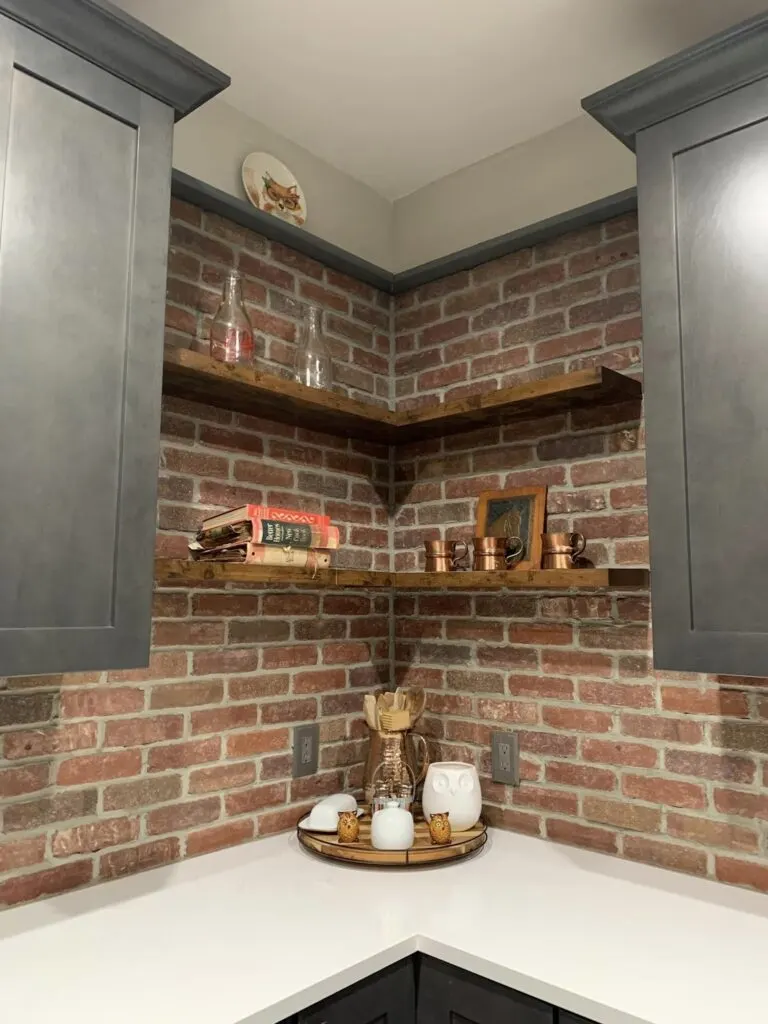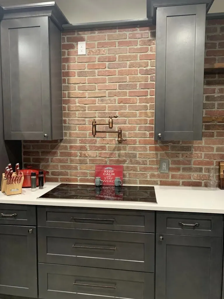 Transitioning to the kitchen, a corridor adorned with sliding barn doors leads the way, seamlessly connecting the living and kitchen areas. Here, the brick wall accent adds a rustic touch that complements the sleek black cabinetry and marble countertops.