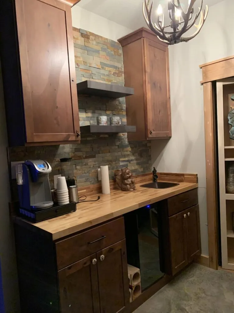 One standout feature that adds a touch of rustic elegance is the antler chandelier, hanging proudly as a focal point, casting a warm glow and infusing the space with charm and character.