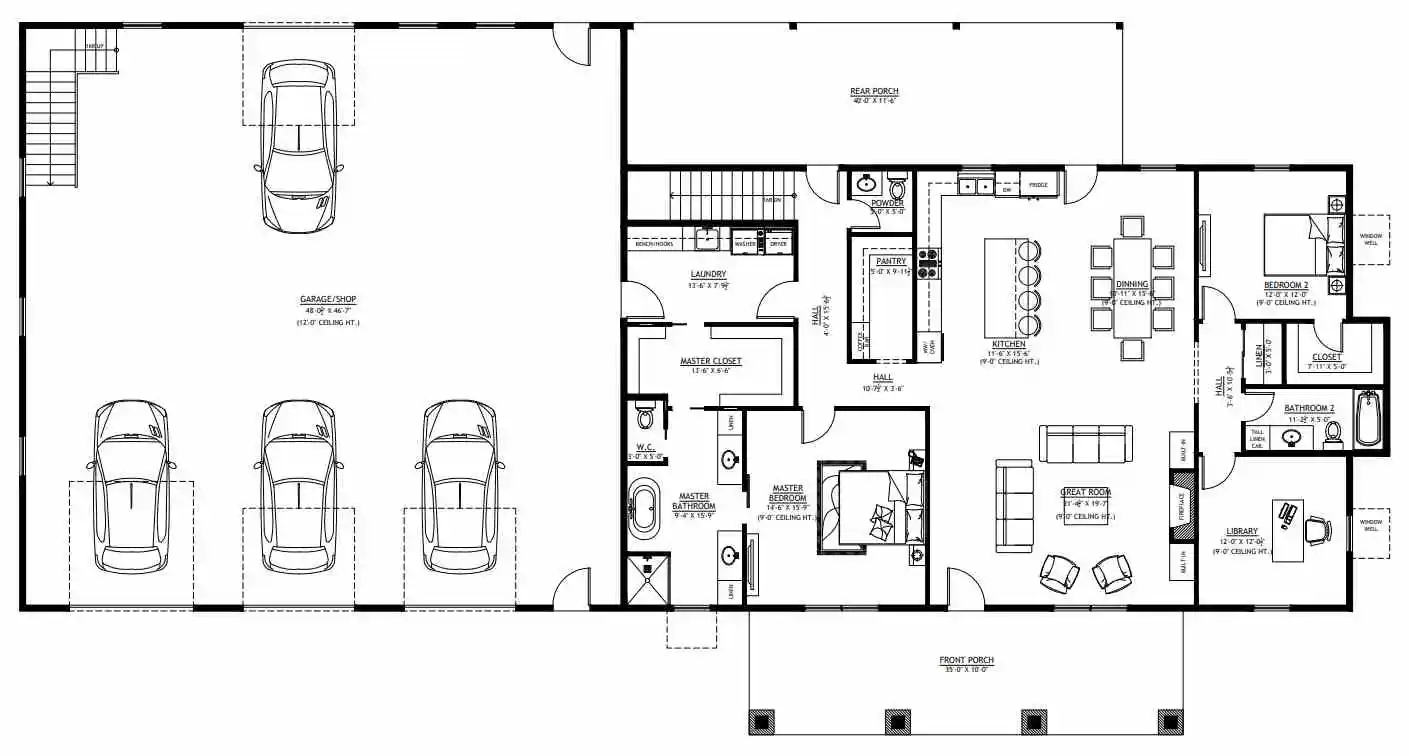 This amazing 40×100 barndominium floor plan is a great example of thinking about the needs of the people living there. With four bedrooms and three and a half bathrooms, it has enough living space for everyone and two rooms that are located way in the back of the barndo. Both of these bedrooms have their own master bath that is perfect for someone who might need to keep different hours than the other people in the house. It also features a large utility room and plenty of storage, including a walk-in pantry. On top of that, the massive living area and front porch provide plenty of social space.