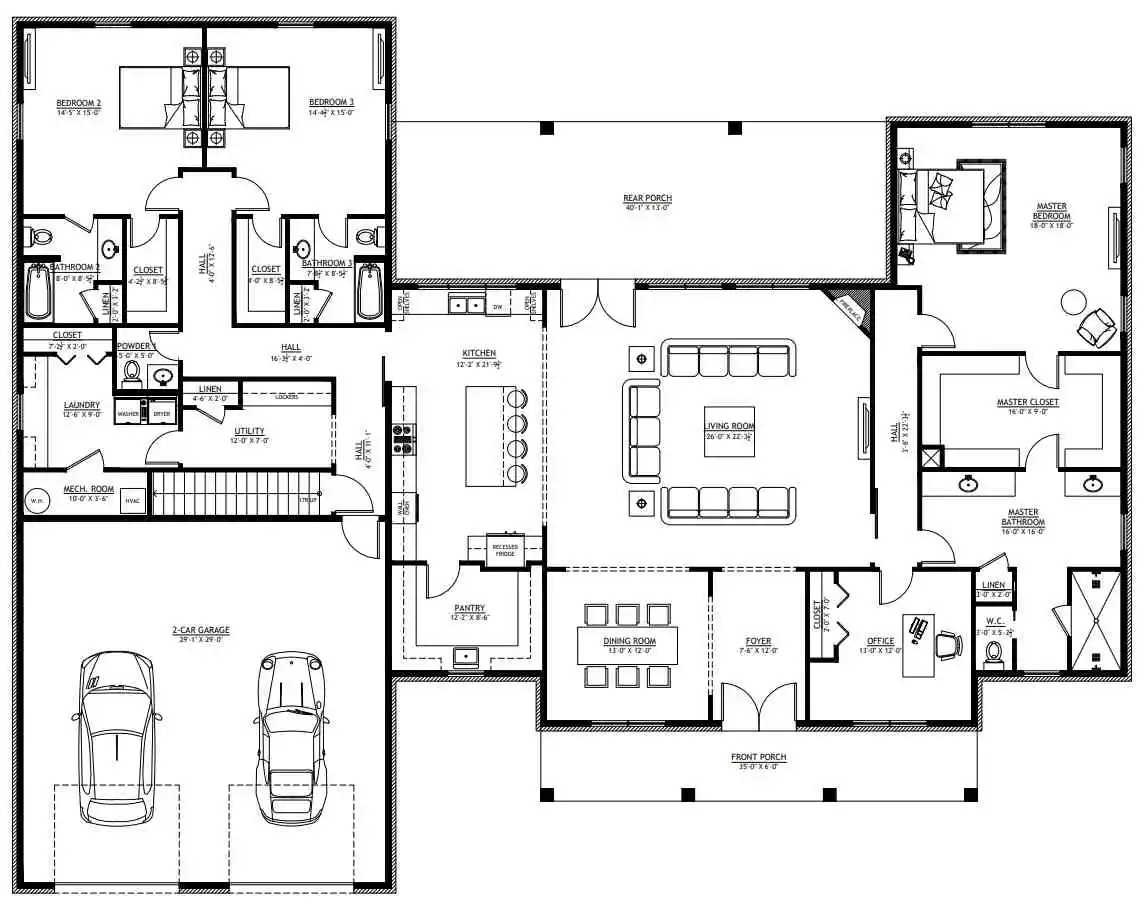 This three-bedroom 40×100 barndominium floor plan is a great choice for someone who needs the kind of office space that might normally be reserved for a master bedroom. The huge 14×17 office sits right at the front of the house and provides an excellent nerve center for everything in the home. With a bathroom right across the hall, there is enough thought put into the traffic flow of this floor plan to make it a perfect choice for all kinds of families. It also features three large bedrooms and three bathrooms as well as a wonderfully open layout of the living area and kitchen.
