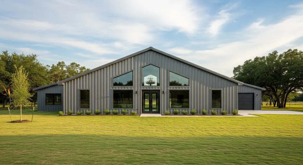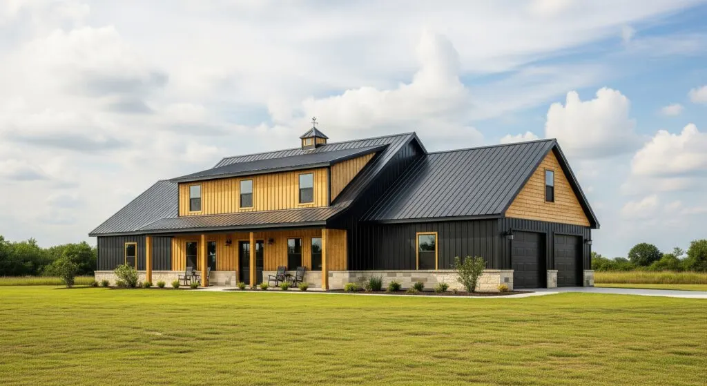 - This is a single-story barndominium-style home with a prominent central gabled section.