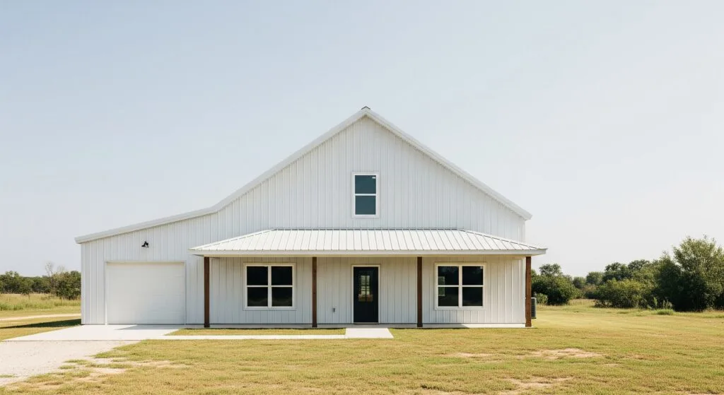 - This is a single-story barndominium-style home with an attached two-car garage on the left.