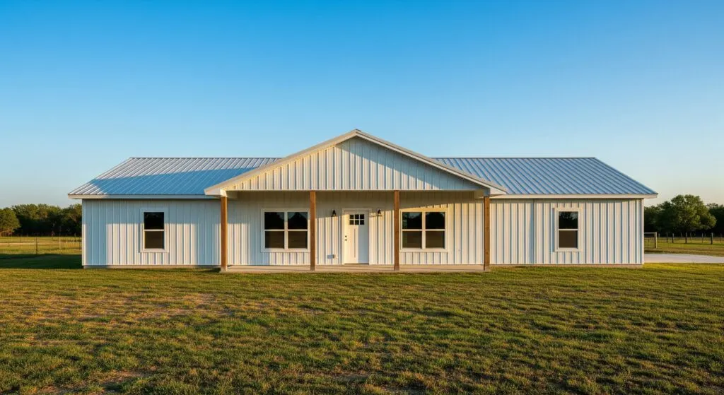 - This is a small and simple single-story barndominium-style home with a central covered entrance.