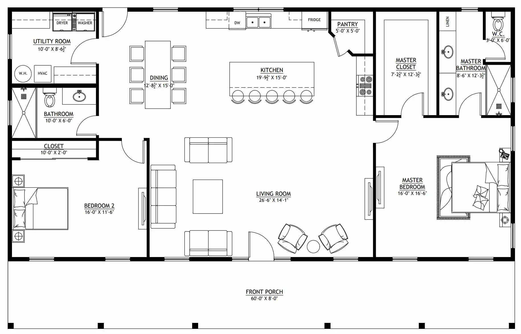 - The home also includes a Mechanical Room (8′-0″ x 12′-0″) and a full-length Front Porch (60′-0″ x 8′-0″).
